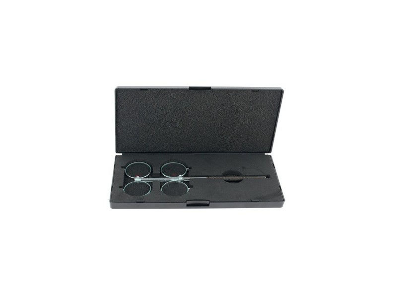 Composé d’une règle métallique robuste, équipée de deux paires de verres correcteurs (deux positifs « + » et deux négatifs « - »). L'écart pupillaire est réglable pour un ajustement précis et confortable. Les verres sont en matériau minéral résistant aux rayures.